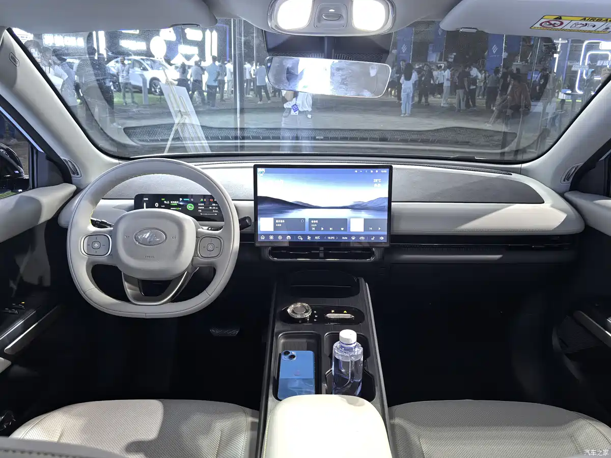 В салоне преобладают мягкие серо-вельветовые тона, создающие уютную атмосферу. В центре расположен 14,6” парящий экран с сенсорным управлением, поддерживающий управление голосом, а ниже — поворотный селектор КП и панель беспроводной зарядки смартфона.