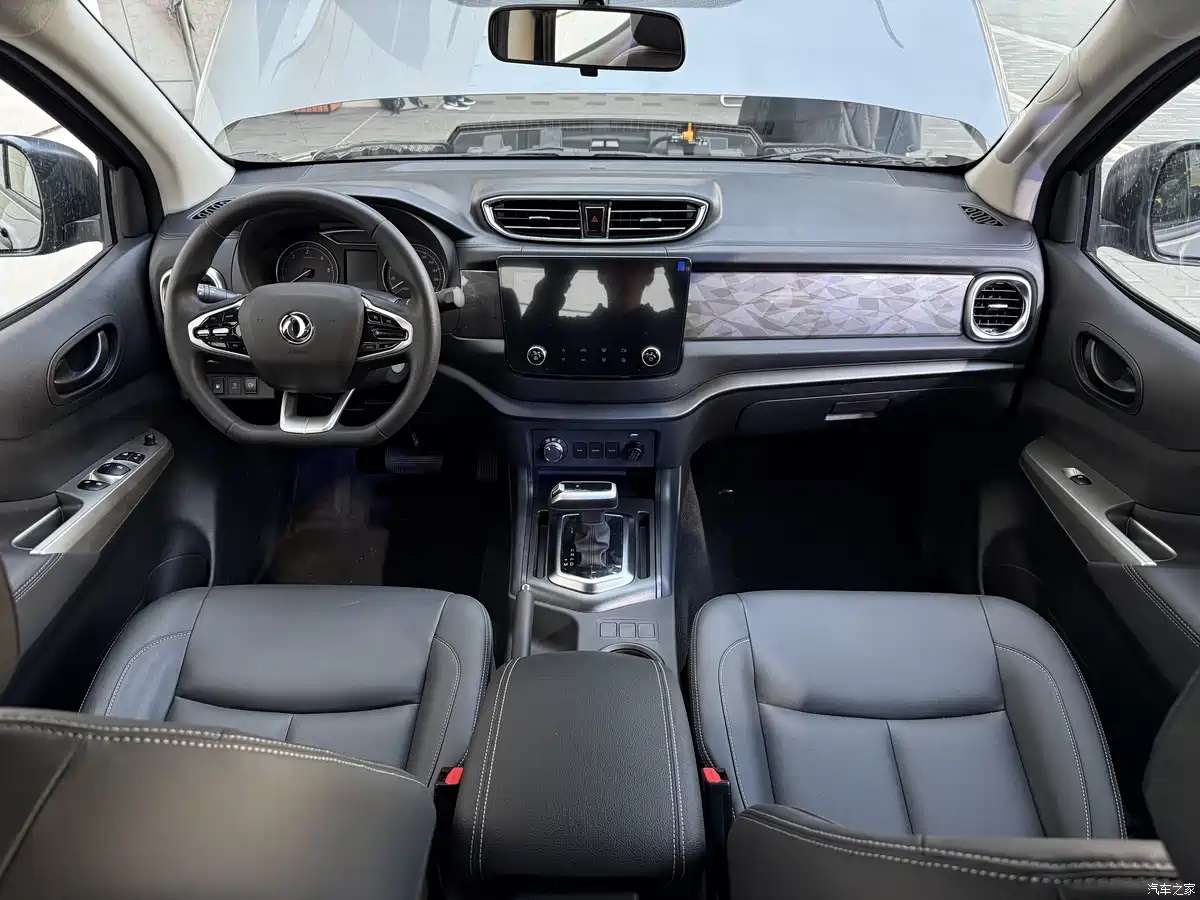Салон оформлен в чёрной стилистике с текстурными вставками. Трёхспицевое рулевое колесо и панель приборов с двумя круглыми шкалами придают кабине современный характер. Центральная консоль содержит радиосистему и блок климат-контроля с физическими клавишами для удобства управления.