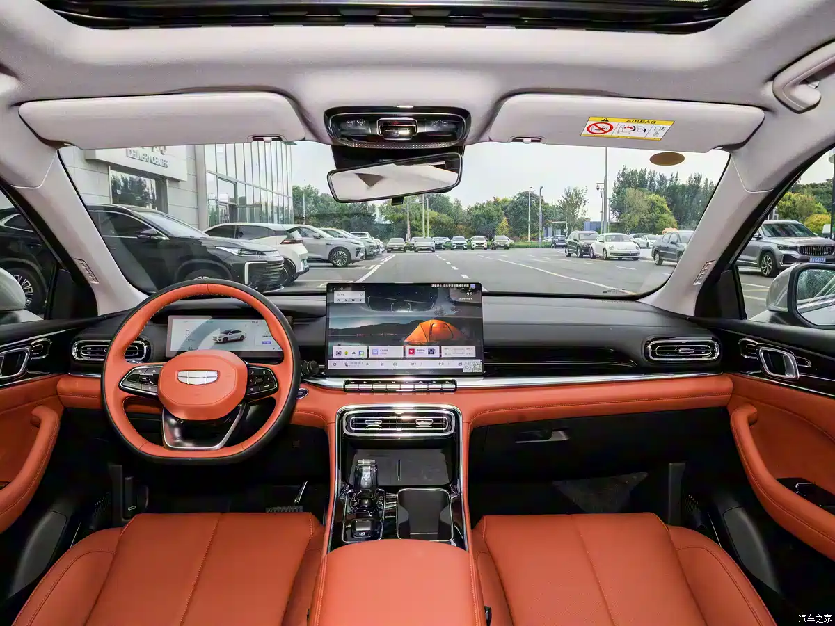 Салон нового Emgrand выполнен с акцентом на комфорт и современный стиль, предлагая три гармоничные цветовые схемы: строгий чёрно-серый, утончённый серый и насыщенный коричневый. В центре: привлекает внимание приборная панель и парящий 14,6" дисплей мультимедийной системы на базе интеллектуальной платформы Flyme Auto. Несмотря на цифровизацию, Geely сохранила удобство традиционных элементов: металлические кнопки под центральной консолью, а также 50-ваттная беспроводная зарядка с активным воздушным охлаждением обеспечивают практичность и функциональность. Элегантные детали, такие как кристаллический селектор передач и четыре потолочные лампы с эффектной подсветкой, добавляют интерьеру премиальной утончённости. Материалы отделки тщательно подобраны: перфорированная кожа на сиденьях, мягкие вставки по панели и многофункциональный двухцветный руль создают ощущение качественного и комфортного пространства, где каждая деталь продумана для приятных тактильных ощущений.